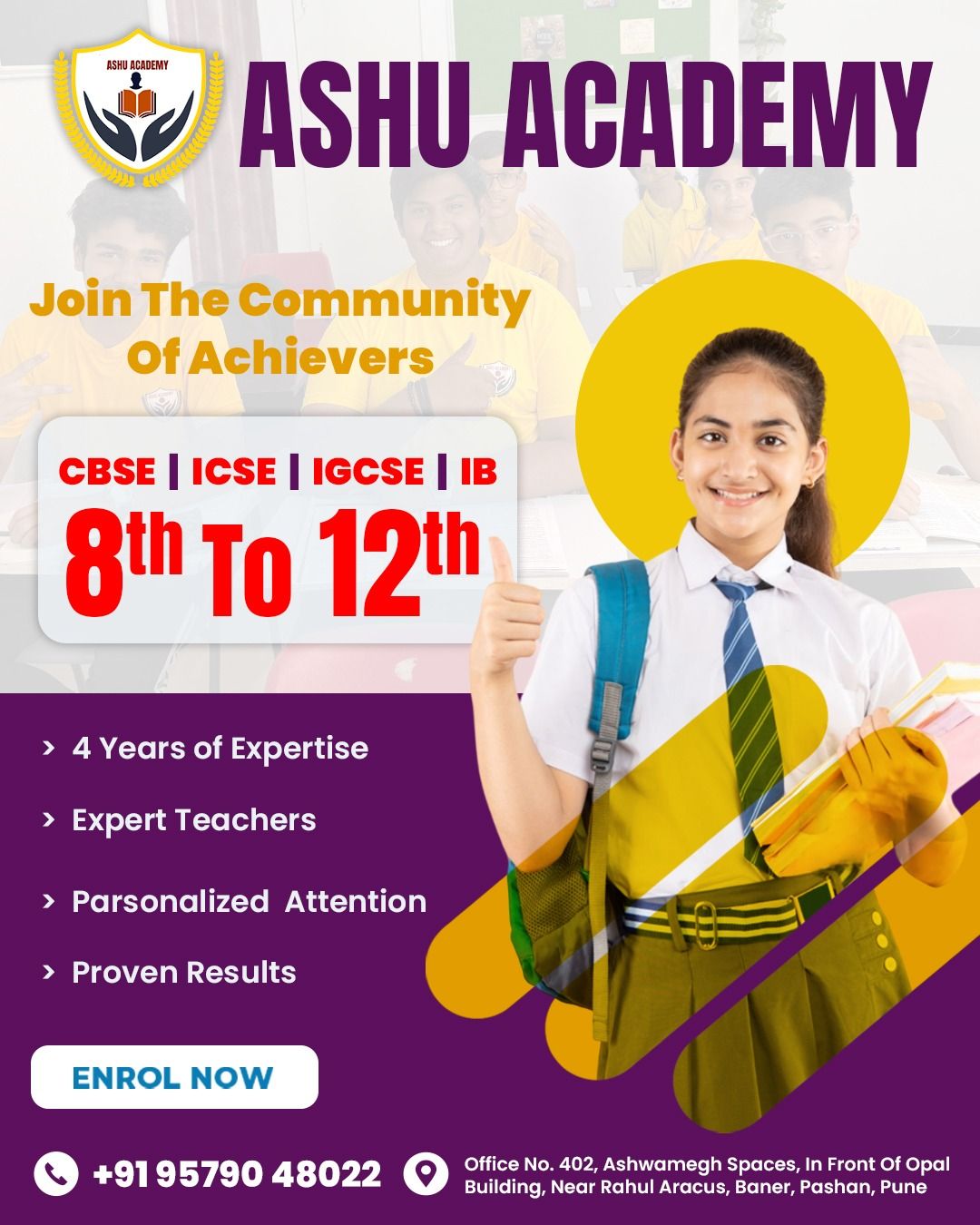 If you are looking for the best COMMERCE CLASSES, K-12 COACHING, NEET COACHING, IIT-JEE COACHING, CET near you then you are at the right place. Students of Class 8, Class 9, Class 10, Class 11, Class 12, Year 1, Year 2, Year 3, Year 4, Graduate, Post Graduate can apply to join Ashu Academy. The institute has highly experienced teachers with experience of 1 to 11 Years. Click on the Contact button to send an enquire now and the institute will give you a call back.
