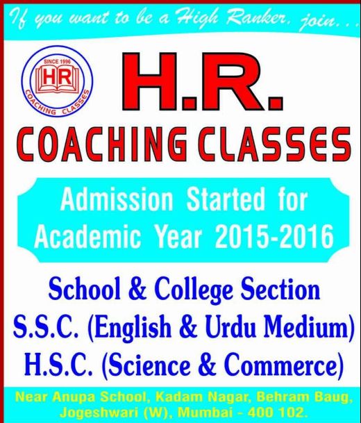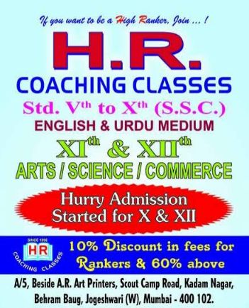 If you are looking for the best K-12 COACHING near you, then you are at the right place. Students of Class 5, Class 6, Class 7, Class 8, Class 9, Class 10, Class 11, Class 12 can apply to join H.R. Coaching Classes. The institute has highly experienced teachers. Click on the Contact button to send an enquiry now and the institute will give you a call back. You can also visit the institute at A/6, Ram Karan Compound, Scout Camp Road, Kadam Nagar, Behram Baug, Jogeshwari West, Mumbai (Maharashtra) - 400102.