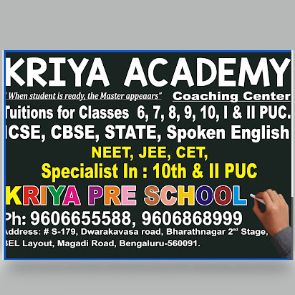 If you are looking for the best K-12 COACHING, NEET COACHING, LANGUAGE CLASSES, IIT-JEE COACHING, CET, PLAY SCHOOL near you, then you are at the right place. Students of Pre Nursary, Nursary, KG 1, KG 2, Class 1, Class 2, Class 3, Class 4, Class 5, Class 6, Class 7, Class 8, Class 9, Class 10, Class 11, Class 12 can apply to join Kriya Academy. The institute has highly experienced teachers. Click on the Contact button to send an enquiry now and the institute will give you a call back. You can also visit the institute at S 179, Dwarakavasa Rd, IInd Phase, Bharat Nagar, Bengaluru (Karnataka) - 560091.